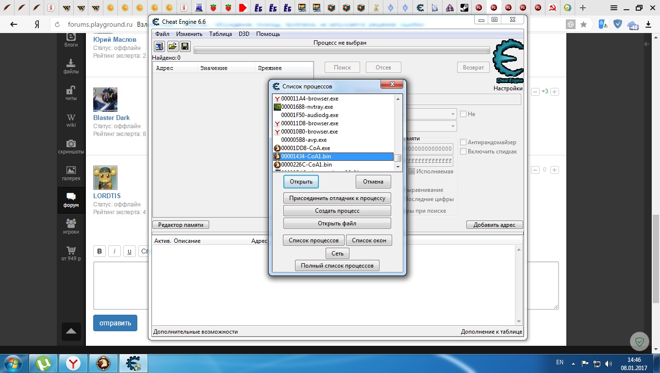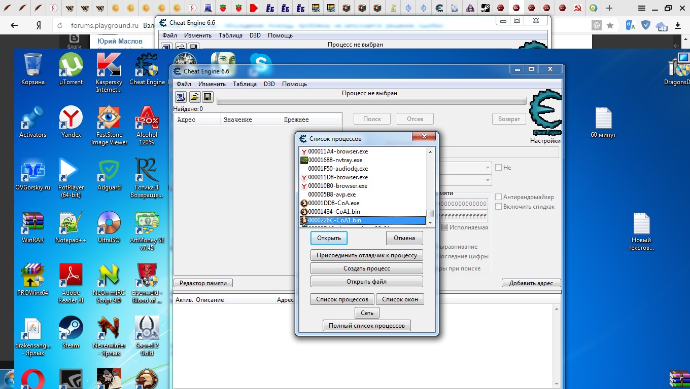 Взламывать нужно процесс CoA1.bin их там 2 будут нужен тот что верхний все ресурсы ищем Double а откат навыков ищем Float (благо есть таймер на экране легче ломать) например на таймере написано 19 сек. мы ищем 18 и т.д. если 15 то ищем 14 ставим 0 и замораживаем обычно всё находится за 2 этапа. всю инфу взял ещё пару дней назад с сайта mrantifun.net