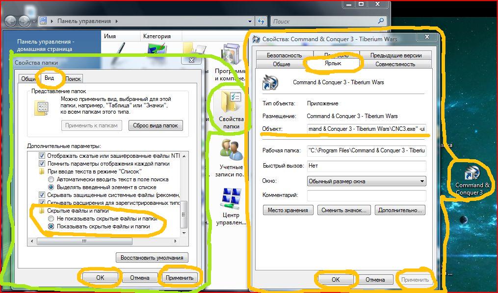с такой инструкцией как написано не у 1го пользователя нечего не пойдет )))) читаем ниже как нужно ))) такс (1е) пуск ->Документы ->Command & Conquer 3 Tiberium Wars->создаем папку "Mods" и запихиваем туда наш мод но для начала не забудьте разархивировать его (должна быть 1на папка с файлами а если будит папка в папке то мод игра не увидит) (в вкратце выше написанное "C:\Users\ имя пользователя \Documents\Command & Conquer 3 Tiberium Wars\Mods") (2е)на рабочем столе находим ярлык игры C&C 3 - Tiberium Wars и тыкаем по нему 2й кнопкой мыши и выбираем "свойства" далее вкладка "Ярлык" там ищем "обьект" и в самом конце строки дописываем -ui чтобы получилось так exe" -ui (после exe" ставим ПРОБЕЛ и дописываем -ui) теперь запускаем игру с ярлыка!!! далее у вас должно открыться окошко от игры с опциями (если вы все сделали правильно конечно :))) далее выбиваем "Просмотр игр" далее вкладка "Модификации" далее выбираем нужную и жмем "запуск игры" ______________________________________ для установок карт используется другой метод заходим сюда C:\Users\имя пользователя\AppData\Roaming\Command & Conquer 3 Tiberium Wars\ и тут находятся нужные нам файлы и папки также многие неопытные пользователи ПК могут столкнутся с тем что папку AppData они не увидят на компе чтобы увидеть нужно сделать следующие Пуск -> Панель управления -> Свойства папки -> вкладка ВИД -> находим строку "Скрытые файлы и папки" далее ставим галочку на отображение таковых (не советую оставлять такие папки видимыми)