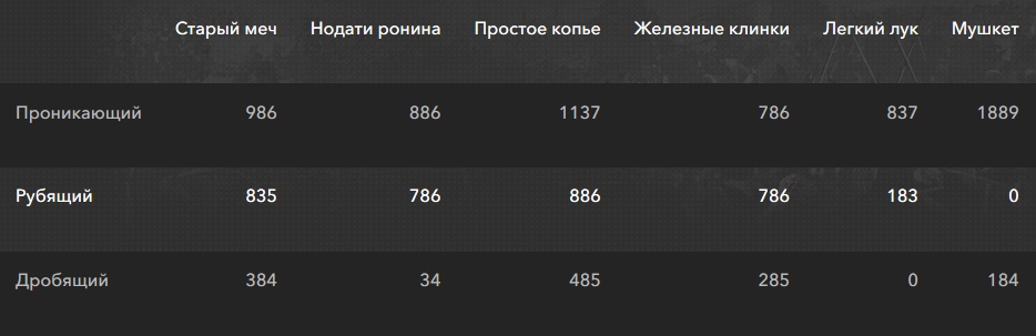 Боевые характеристики можно классифицировать по-разному. Проще всего — по типу наносимого урона, которых существует три (помимо эффектов, основанных на навыках — вроде огня и яда). Вы можете наносить уколы (наконечником стрелы, острием меча или копья), рубящие удары лезвием (нодати, алебарда, глефа), а также бить тупым оружием (древко, приклад мушкета).