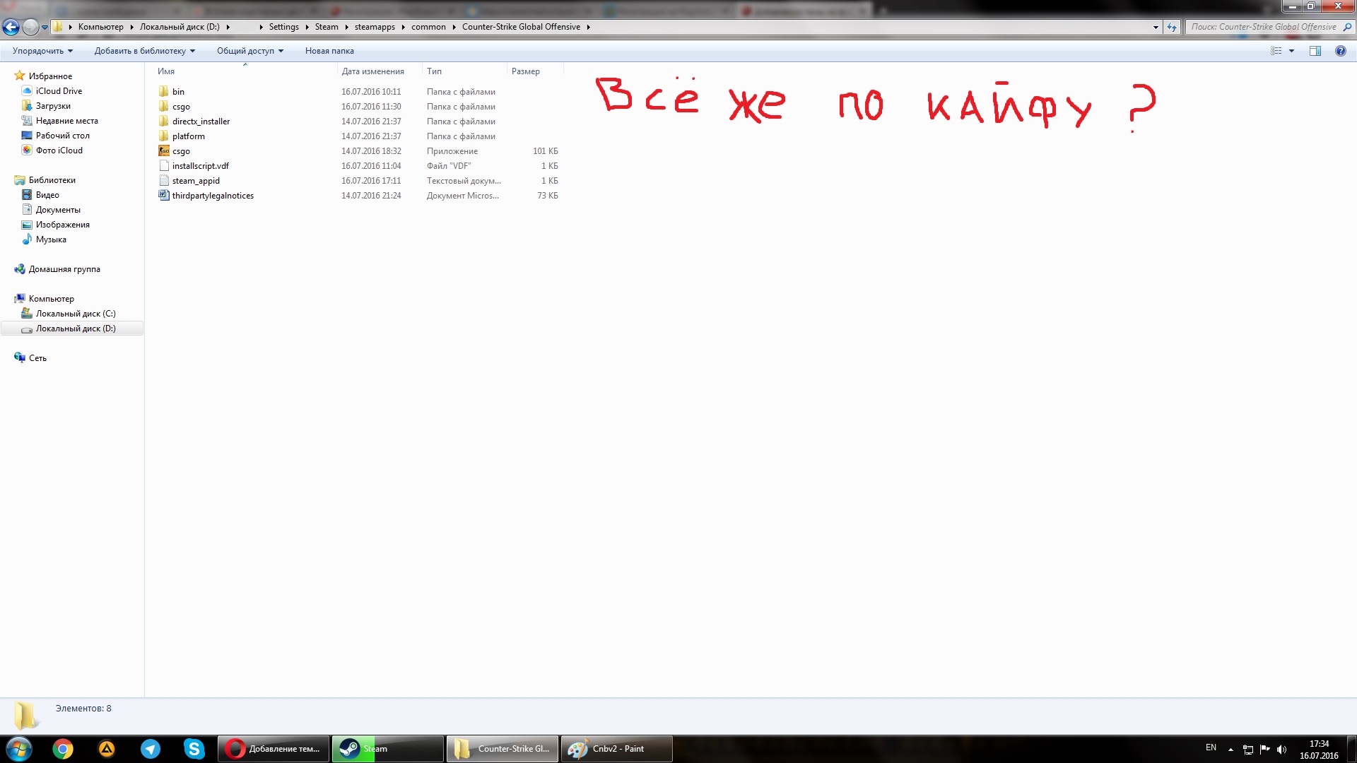 Ребят, скачал позавчера (14.07.16) CS:GO играл нормально. Сегодня сыграл одну игру в ММ и выключил вместе со Стимом. Далее мемасики сидел скролил и тут вырубает свет. Через часик включаю компутер, думаю дай сыграю, а мне Стим пишет, что CS:GO не установлена: