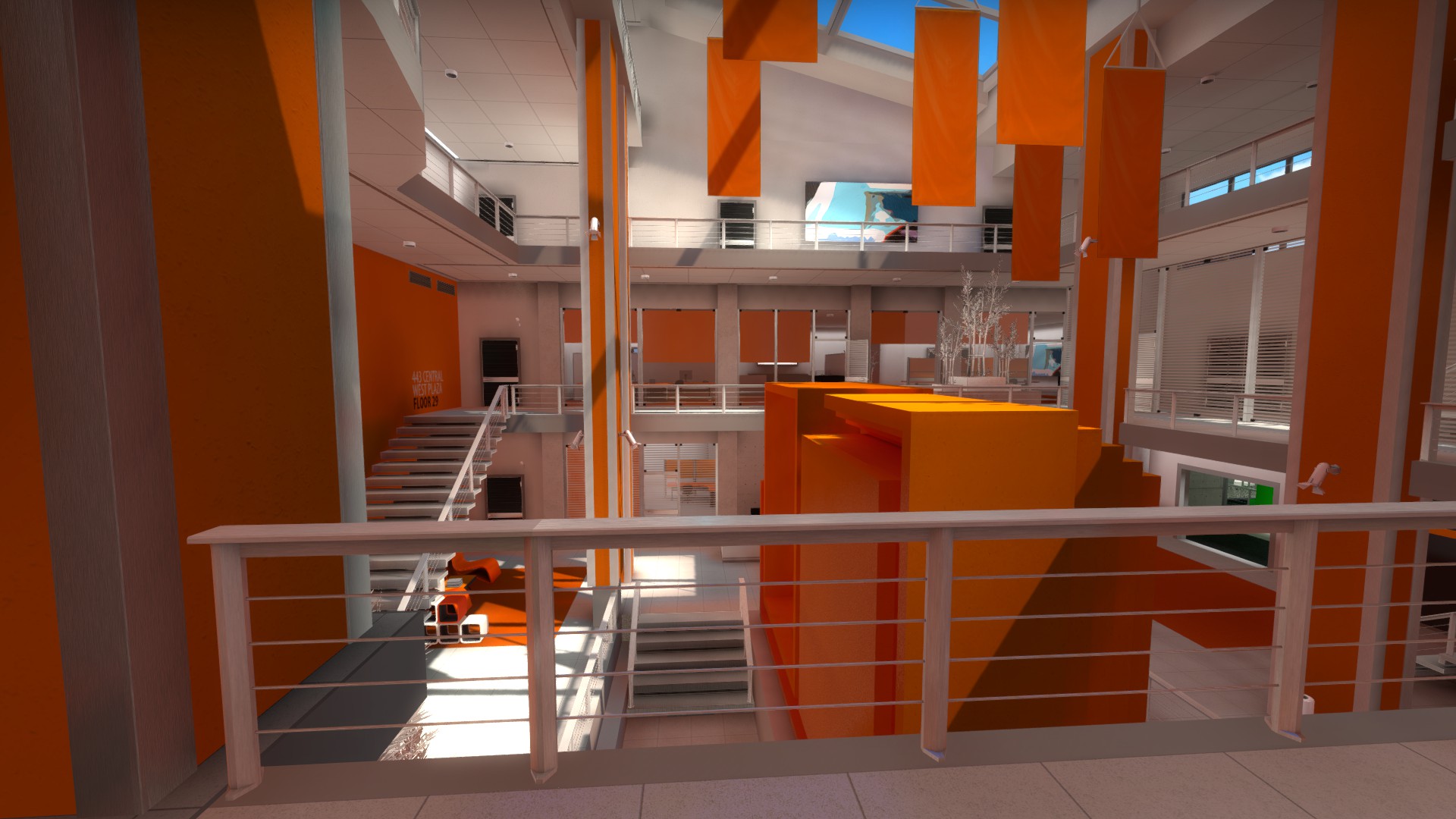 Карта, которая располагается на высоком небоскребе. Честно говоря, не знаю, как назвать это помещение, пусть это будет штаб-квартира :) Выполнена в трех цветах, мало того, помещение реально огромное, в три уровня, и там реально приятно играть. Чем-то карта сходит на игру Mirror Edge :D