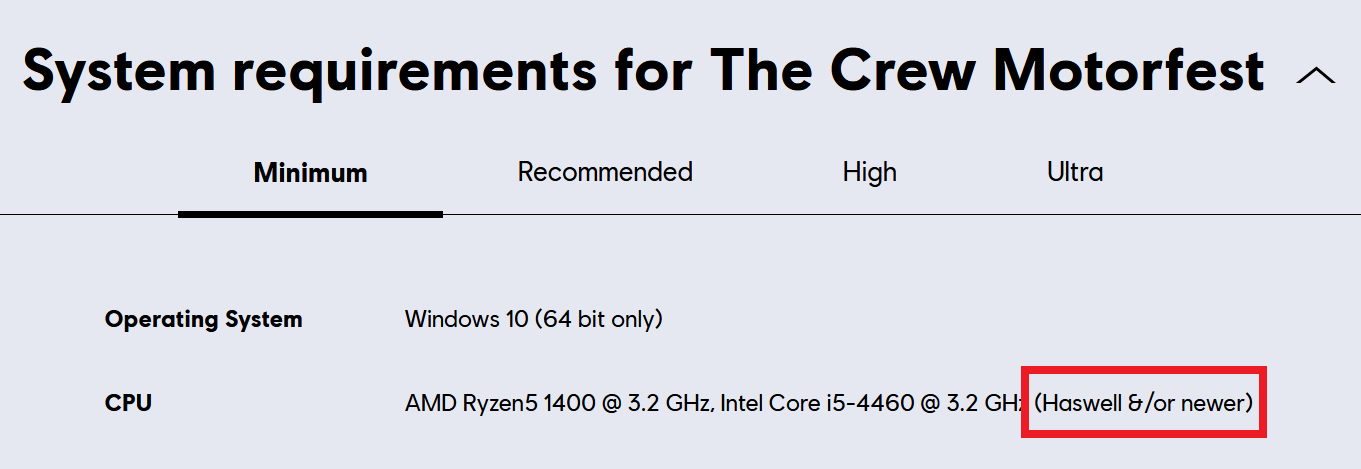 Если не ошибаюсь, как и её предшественница (The Crew 2), игра требует процессор с инструкциями AVX2. В минимальных системных требованиях как раз такие. Системки (из магазина юбиков):