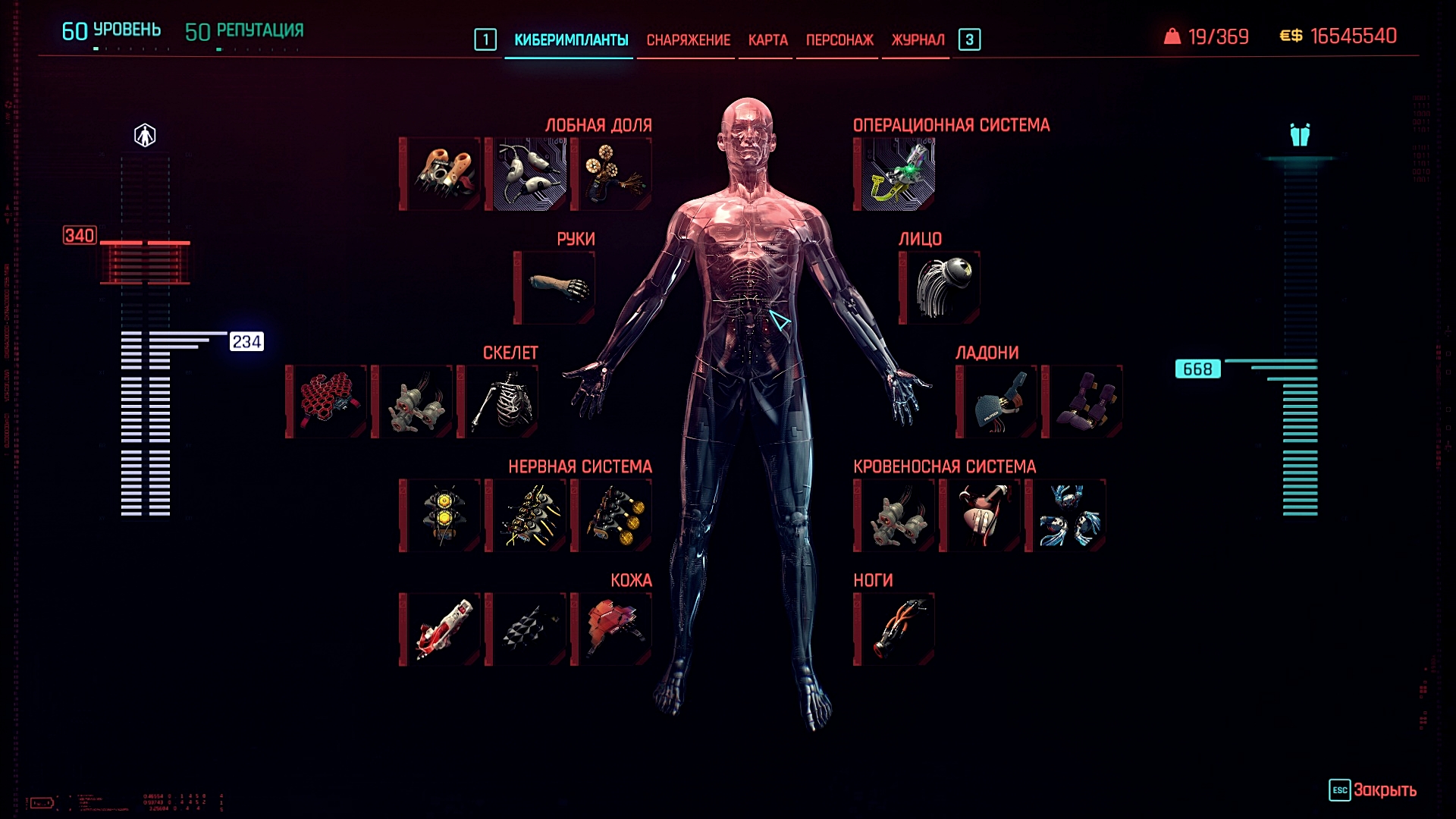 Все что можно было максимально открыть, открыто и вкачано, доп. киберимпланты, машины/мотоциклы, культовое и легендарное оружие, рецепты, много денег и компонетнов. Остальное по сюжету.
