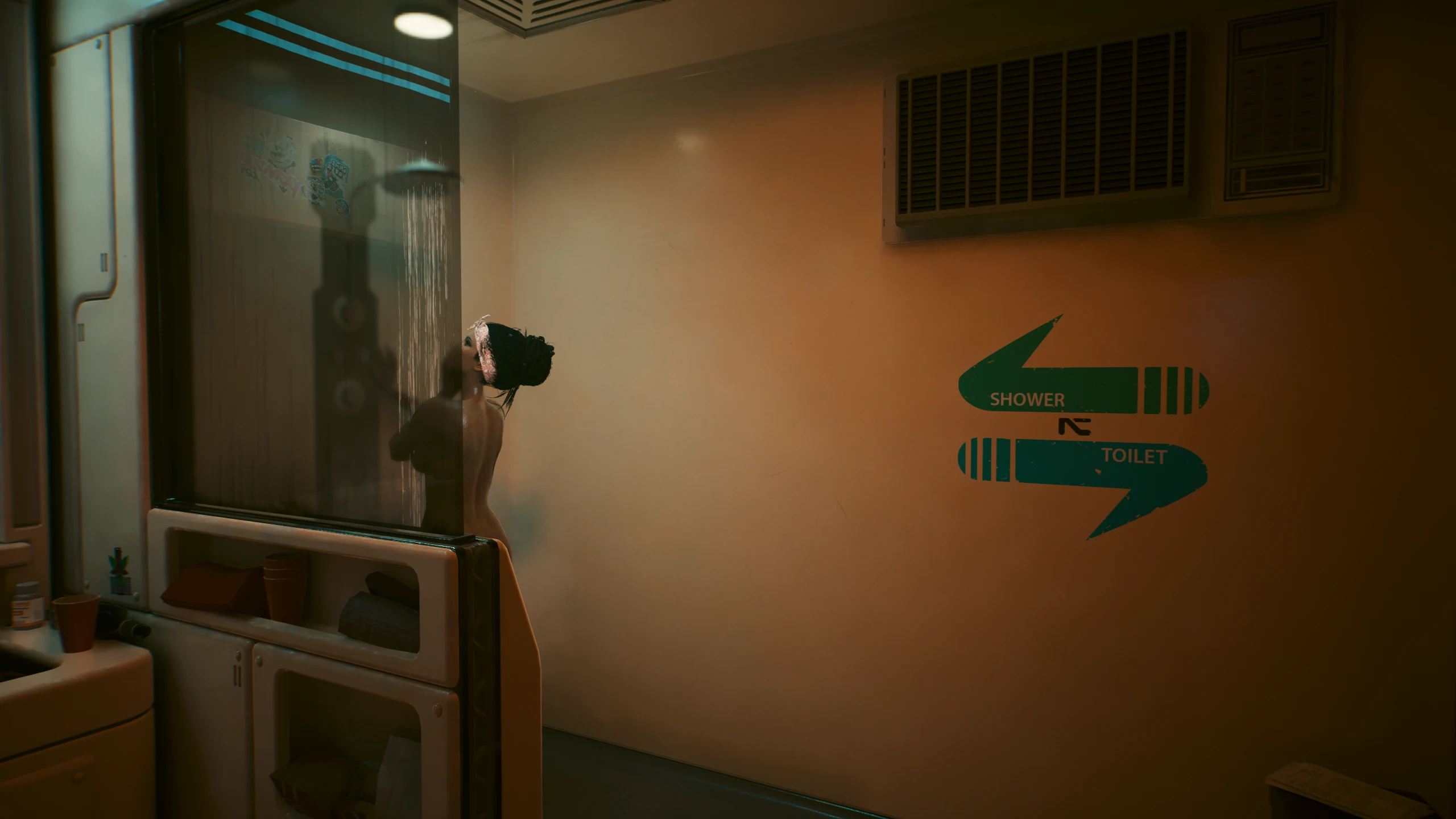 Между (потенциальными) посещениями будет промежуток в 3-4 игровых дня. Когда она сообщает о приходе, Ви может сказать ей, что ей не нужно спрашивать, и с этого момента ей не понадобится отвечать. При принятии душа Панам будет голой.