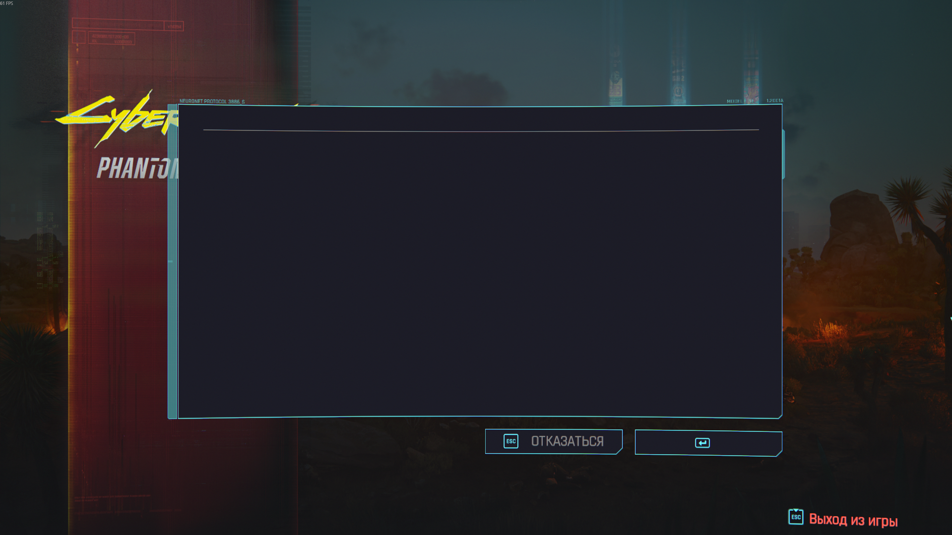 Это обновлённое лицензионное соглашение с которым нужно согласиться. Но согласиться пролистав до конца его. А не даёт его прочитать какой то мод, типа перевода Дрим войс. Чтоб не искать какой мод мешает временно преименуй папочку Директория с игрой\archive\pc\mod в mod1. Это отключит почти все моды. Запусти игру. Теперь у тебя уже будет текст в этом окошке, который ты сможешь прочитать или просто пролистать и согласиться.. После этого ты можешь выйти из игры. Переименовать обратно папку mod1 в mod. Больше это окошко тебя не будет волновать.