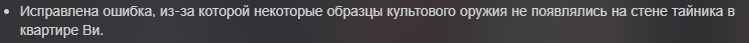 Столкнулся с проблемой после обновления 2.0 в тайнике Ви перестало отображаться культовое оружие, будь то Бензопила или Псалом 10:6 или любое другое культовое, выкладываю в тайник, но стенд остается пустой. Перезагружал, загружал другие сохранения, проверял файлы, ничего. (Игра чистая, без модов)