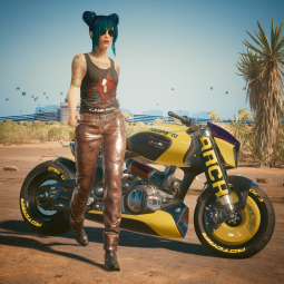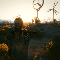 Вот и у меня слишком "цветастый" персонаж получается: жёлтая самурайка, синие штаны от Тигриные Когти, боты тоже с подсветкой.. а хотелось бы собрать билд похожий на персонажа Кэй из Balderunner 2049 :)