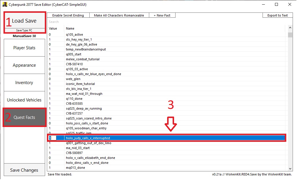 4. После загрузки сохранения, переключаемся слева на вкладку - Quest Facts