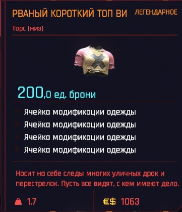 3) Удаляем данные имеющихся модификаций нажатием на кнопку remove, получаем предмет с максимально возможным количеством слотов. Особенно актуально для предметов одежды, которые в игре могут быть как совсем без слотов, так и с четырьмя (куртки, футболки и пр.), или тремя (штаны, ботинки, очки и пр.) слотами для модификаций. Недостаток: пропадают установленные модификации. Культовые предметы таким образом не редактируйте, можно потерять уникальные свойства, например вероятность EMP у Иньлуна. Культовые предметы, как правило, уже с максимальным количеством слотов в легендарном качестве, и имеют чертежи для улучшений. Одежду Джонни смело редактируйте.