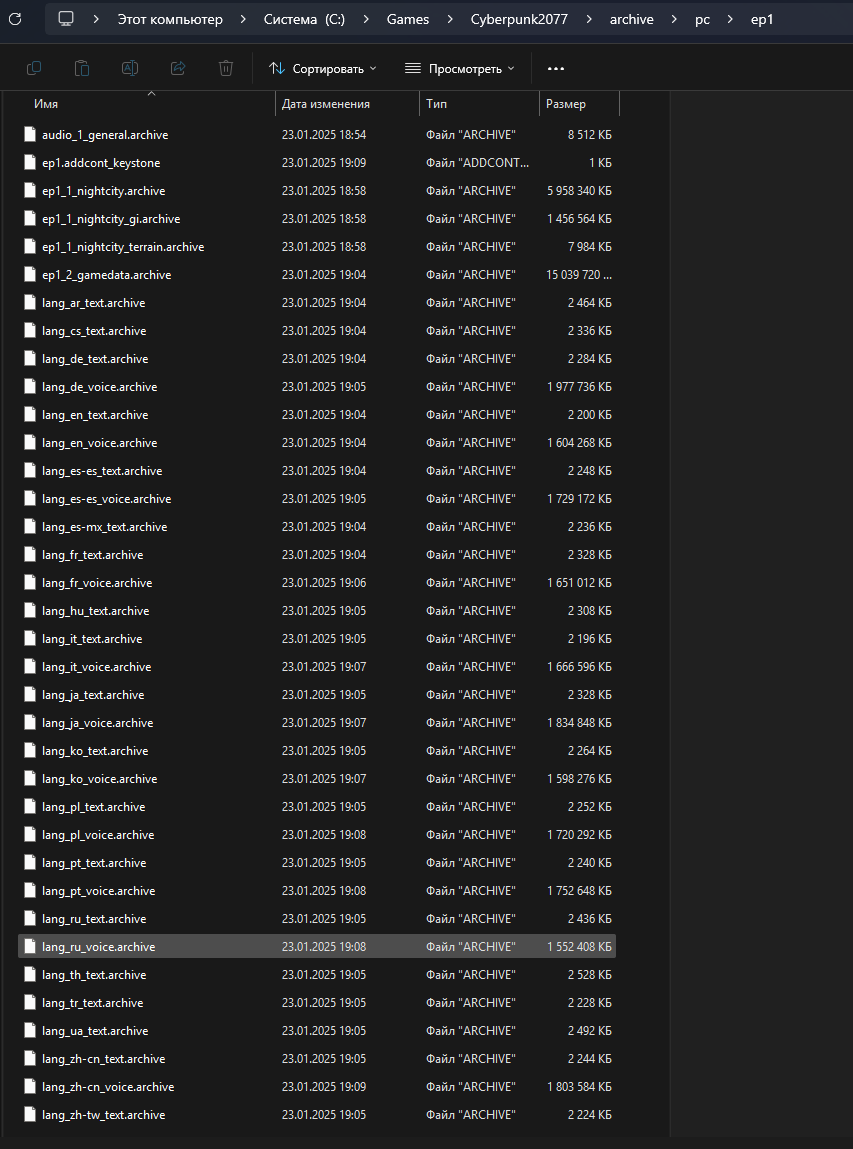 Такой же файл как и в основной игре присутствует файл - lang_ru_voice.archive. И размер его аж 1,5 гектара.