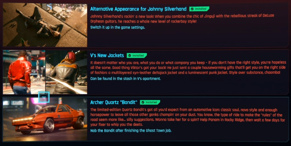 Первое дополнение будет исключительно косметическим. Рипердок Виктора пришлет в ваш гардероб несколько стильных нарядов. Игрок получит особое сообщение от персонажа, после чего в гардеробе можно будет найти новые вещи.