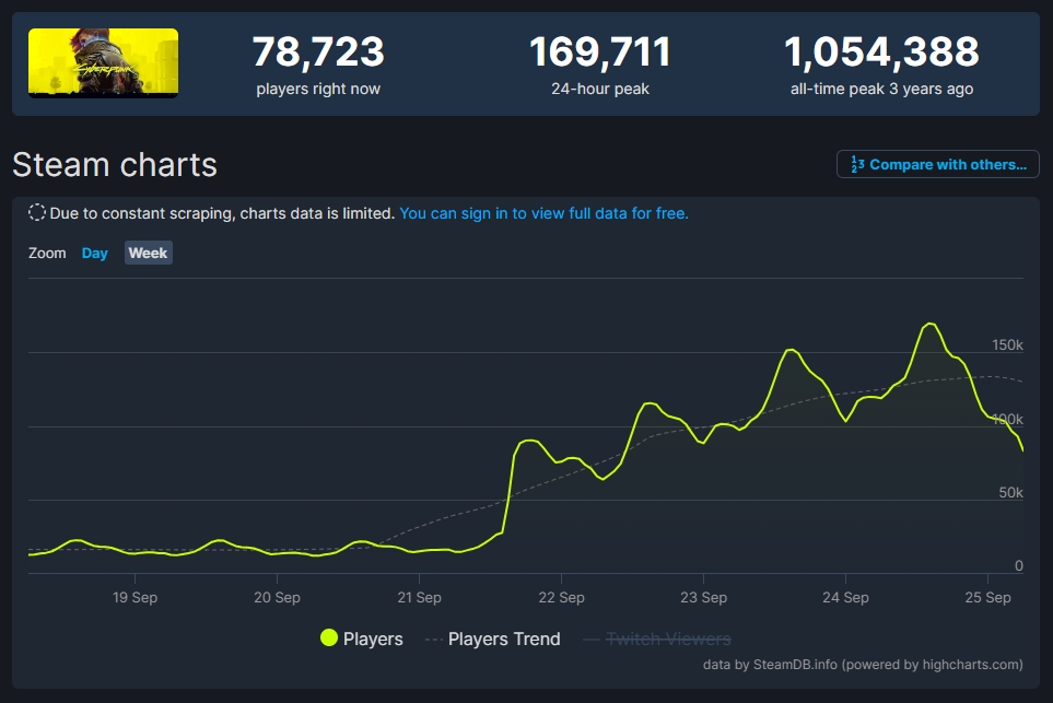 21 сентября 2023 года вышел глобальный патч 2.0 для Cyberpunk 2077. После этого значительно вырос онлайн — на момент публикации пиковый показатель составил 169 711 игроков.