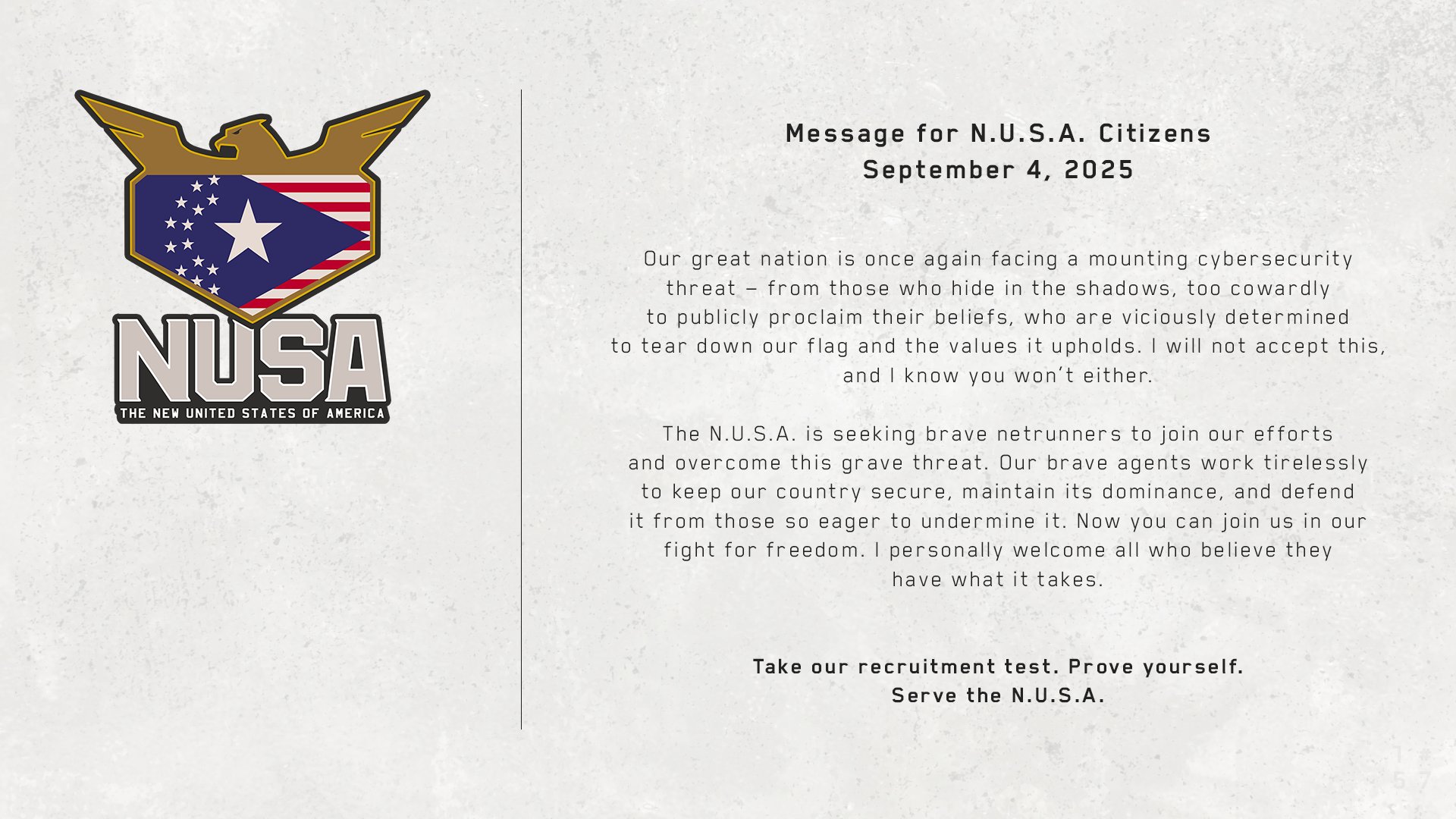В непонятном посте в социальных сетях различные официальные органы Cyberpunk 2077 опубликовали «Важное сообщение для граждан NUSA от президента Розалинд Майерс». Прилагается объявление от 4 сентября 2025 года, в котором говорится, что «Наша великая страна снова столкнулась с растущей угрозой кибербезопасности», и предлагается «отважным нетраннерам присоединиться к нашим усилиям и преодолеть эту серьёзную угрозу».