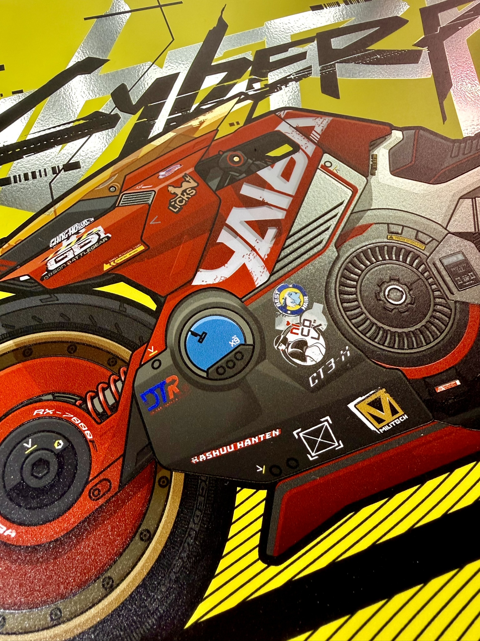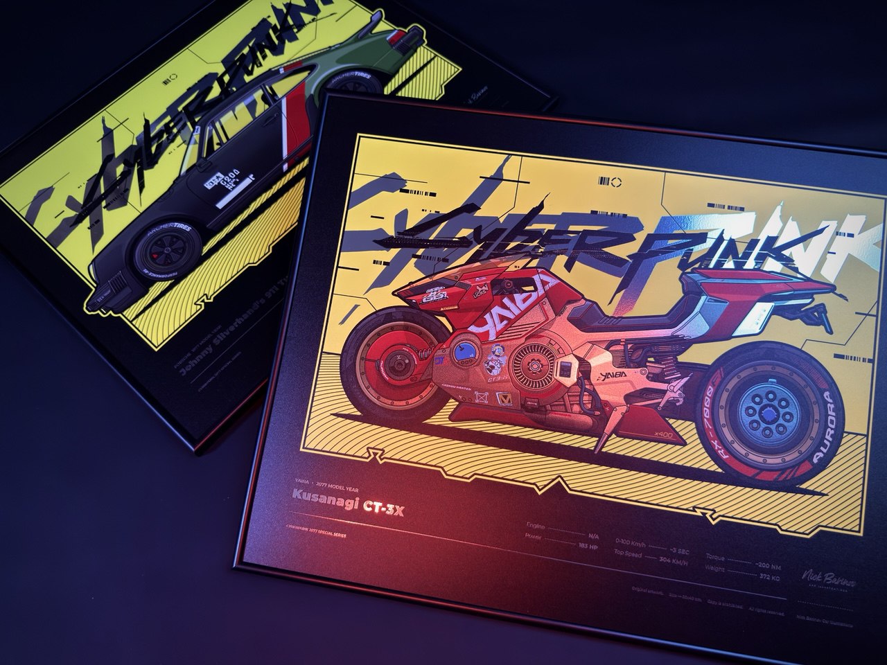 Пусть этот постер и не является официальным мерчем игры, но его детализация и качество поражает : все наклейки на своих местах, металлические части мотоцикла блестят как настоящие (специальная технология печати), а в спецификации мотоцикла спрятана пасхалка для хардкорных фанатов игры, ведь после патча 1.5 характеристики Kusanagi сильно понерфили.
