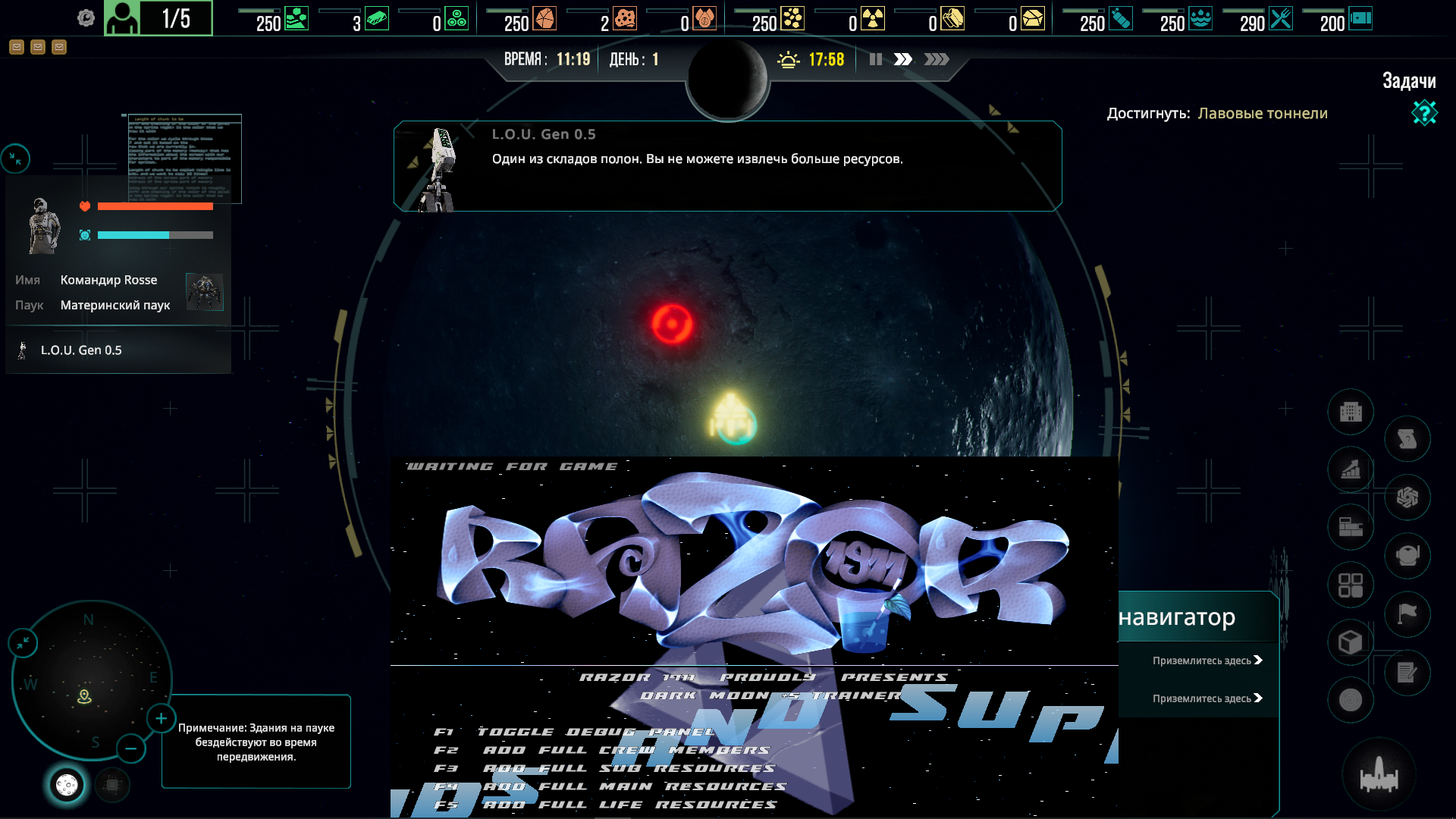 - F3 – Добавить полные ресурсы подлодки