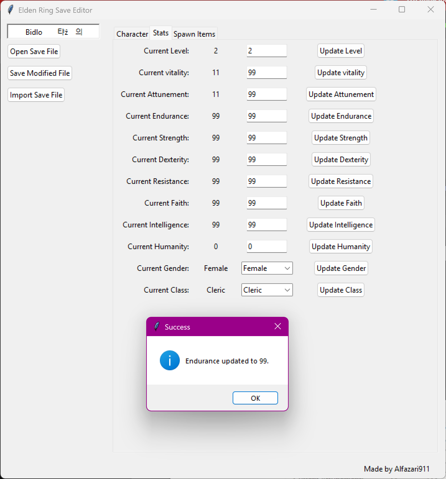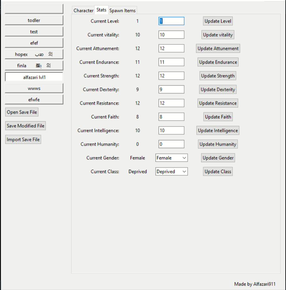 - Редактирование атрибутов: Живучесть, Выносливость, Сила, Ловкость, Интеллект, Вера, Удача