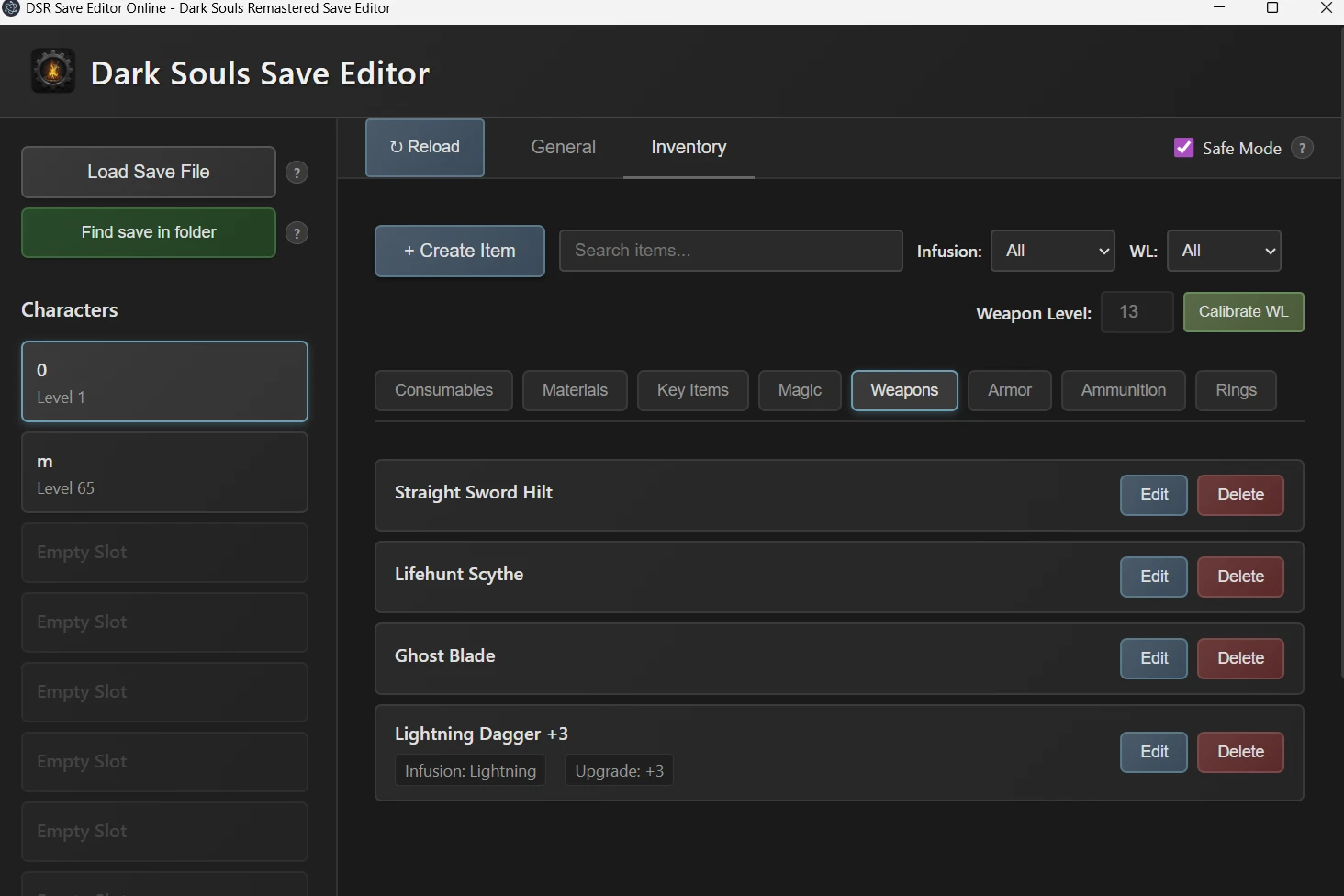- Редактирование характеристик – Уровень, VIT, ATN, END, STR, DEX, RES, INT, FTH