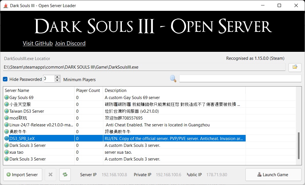 Поэтому, заручившись Dark Souls III - Open Server (ссылка на Nexus https://www.nexusmods.com/darksouls3/mods/1323), я решил запустить свой частный сервер.