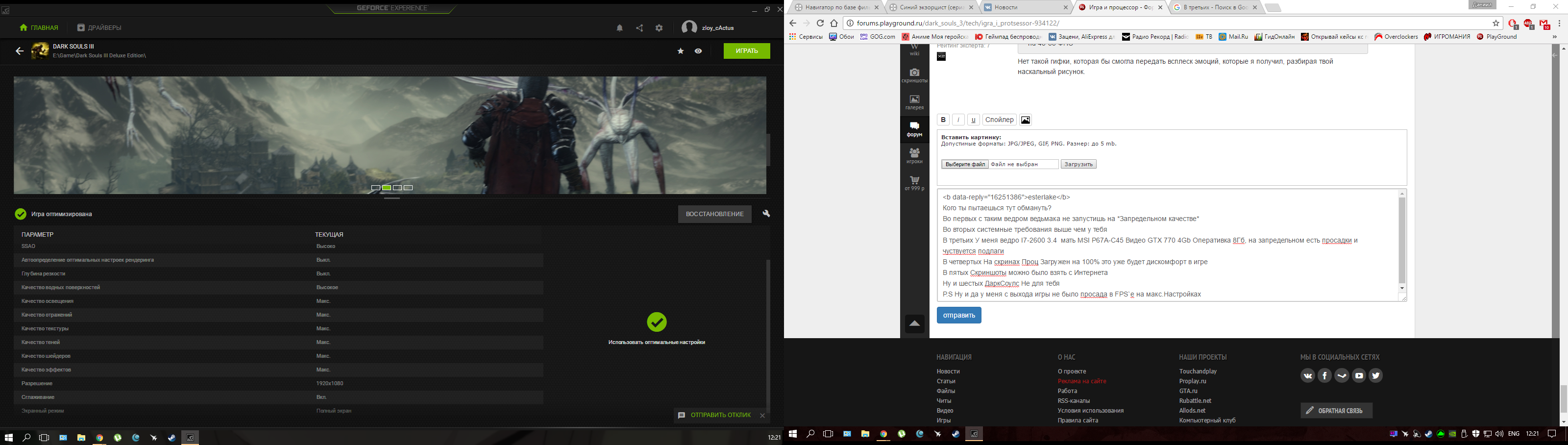Не пишите глупости, не разобравшись в вопросе. Решающим фактором здесь является разрешение в котором рендерится картинка. У меня на i5 3470/GTX670/8Gb RAM, Ведьмак 3 шел на ультра настройках со стабильными 60 FPS с редкими просадками в Новиграде до 55-ти fps. Но на разрешении 1280х1024, так как монитор 17” 5:4, и это его родное разрешение. Поэтому картинка четкая и никакого мыла, как некоторые думают. Если вы на FullHD мониторе выставите такое разрешение, то получите мыло. Если с теми же настройками запустить его в разрешении 1920х1080, то вы получите слайлд-шоу 15 -25 фпс. Что касается Dark Souls III, то игра действительно более требовательна к железу, чем тот же Ведьмак, и автору топика с такой конфигурацией, не стоит рассчитывать на большее. На моей конфигурации, DS III, в разрешении 1280х1024, тени на высоком, остальное на максимуме, выдаёт стабильные 60 fps. Просадки были только в Груде отбросов. Выкладывать скрины с Experience – верх некомпетентности. Ни разу эта бесполезная фигня не выставила правильно настройки для комфортной игры. Всегда настраиваю всё вручную.