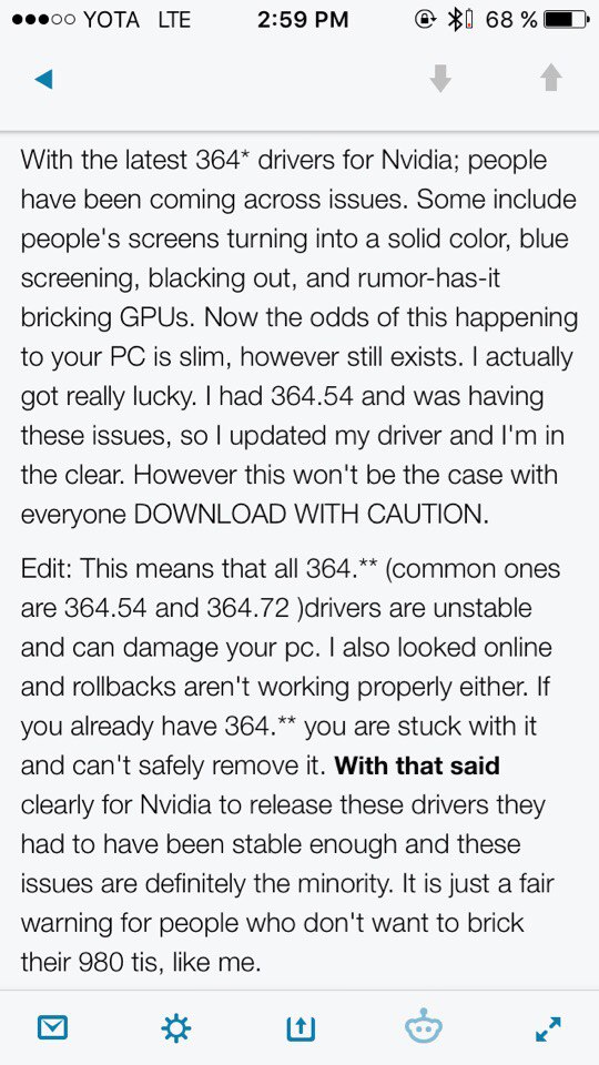 Хоспаде, переводите текст нормально: там написано "по слухам". Перерыл всю тему на Reddit, никто не видел брикованых карт, только "слышал" о них. У меня, правда, после установки драйвера видеокарта убила собаку, пруфов нету но поверьте!