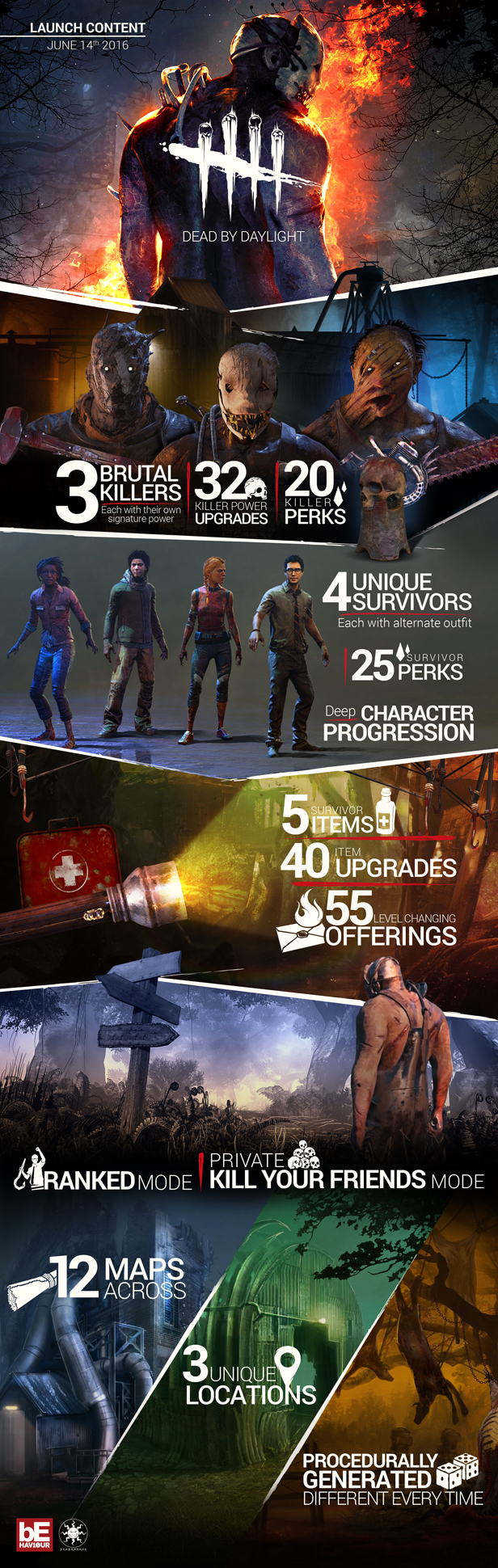 Студия Behaviour Digital Inc предлагает достаточно контента для того, чтобы с самого начала у Dead by Daylight был хороший онлайн. И они не прогадали - игра уже набрала около полутора тысяч обзоров, большинство из которых - положительные. С одной стороны - три убийцы (маньяк, призрак, реднек), 32 апгрейда их умений, 20 смертоностых перков. С другой - 4 жертвы, 5 предметов, 40 апгрейдов предметов и 25 смекалистых перков. Наконец, и убийцы, и жертвы могут изменить условия на карте в свою пользу с помощью любого из 55 приношений (offerings).
