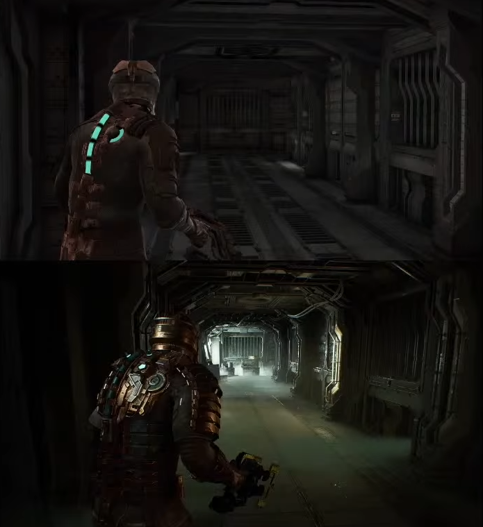Да что то не очень тянет на ремейк судя по сравнению да новый движок и тд но добавили освещение в местах где оно особо то и не нужно тем самым портит атмосферу, по геймплею видно еще работать и работать, Айзек ходит так как будто боится на какашку наступить, да и костюм как то слишком выделяется на фоне может просто пока тени толком не доработали.