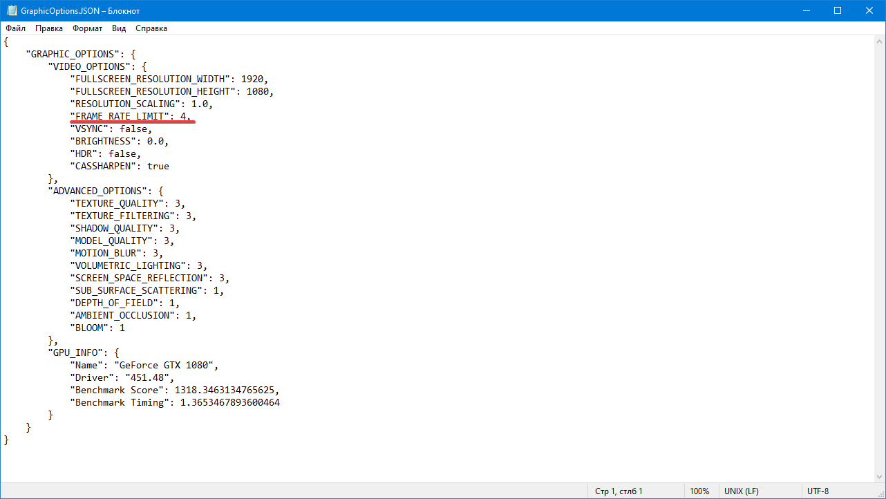Идём в директорию с игрой и ищем файл GraphicOptions.JSON , открываем его с помощью блокнота.