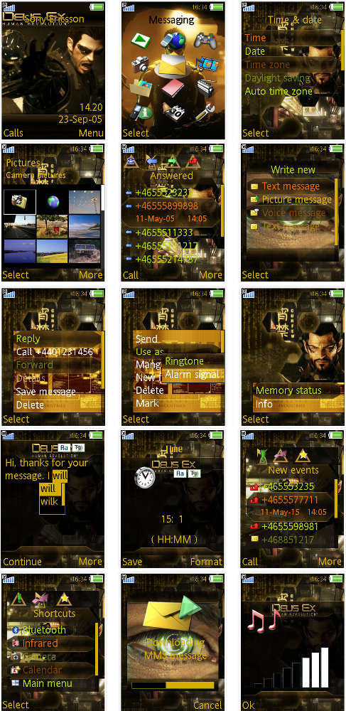 а намесил то...нифига не видно...во 1x фоновый рисунок надпись DEUS EX сливается с оператором,во 2x обои как и сама игра выполнена в черно-золотистом стиле поэтому ЗЕЛЁНЫЙ ТЕКСТ и ГРОМКОСТЬ БЕЛОГО ЦВЕТА мягко говоря не уместны,и опять же ты везде понасовывал DEUS EX DEUS EX DEUS EX...в 3x где передача сообщения воще не понятно че будет написано...и в 4x время...настройка времени-к твоим свелениям черный цвет всегда сливается с черным как бы тебя этот факт не разочаровал...поэтому только за старания +1