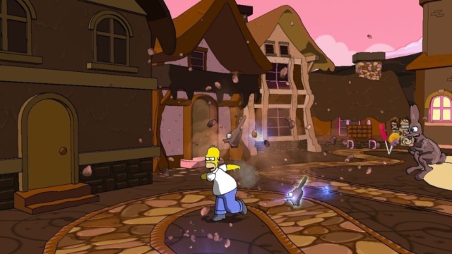 На первом уровне мы играем за Гомера, учимся, так сказать, азам управления, раздаем люлей шоколадным зайцам, а в конце уровня так и вовсе Гомер превращается в здоровый шар и давит врагов массой. Все остальные миссии проходятся за двоих персонажей между которыми можно переключаться. А можно найти закадычного дружищу и пройти с ним игру в режиме сплит скрин. Каждый из героев обладает собственными умениями: Барт изображает из себя бэтмена - может парить в воздухе раскрыв плащ или цепляться крюком кошкой к стенам преодолевая препятствия, Лиза с помощью статуи Будды обладает способностью возвыситься высоко над уровнем и, как в стратегиях, волшебной рукой передвигать предметы и так далее.