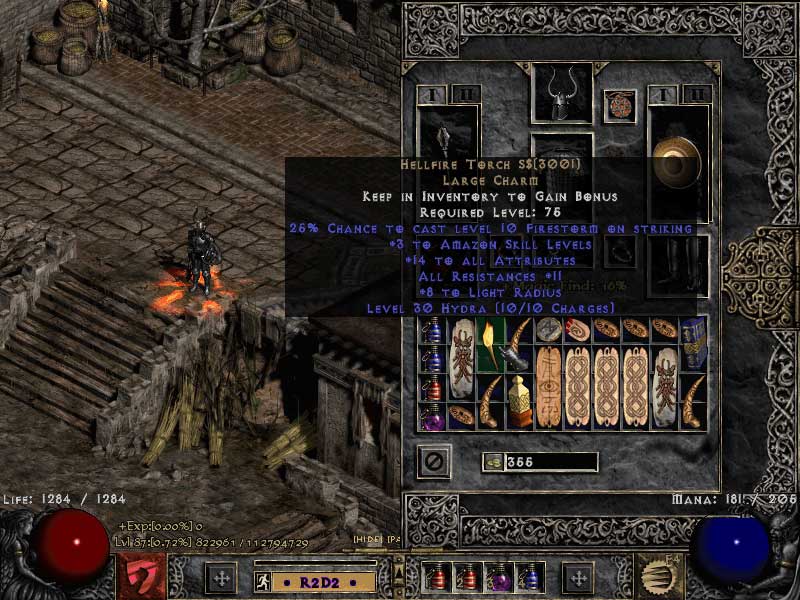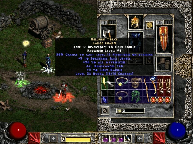 Firestorm с торча, кстати, версии Diablo — больше дорожек, урон огнём + физикой (у друида и на щите Phoenix более слабая версия с огненным уроном). В патче 1.13 шанс прока Firestorm понизили до 5% — в раскраске (ремастере) такой же худосочный торч. Отличия баг торча на Рубаттле / Плейграунде от обычного: может иметь 20+ статов / 20+ резов (вроде 26 / 26 или 27 / 27 максимум выбивали, о более крутых не слышал), требует 94 уровень и прокает 25% Chance To Cast level 15 Firestorm On Striking. Выглядит так:
