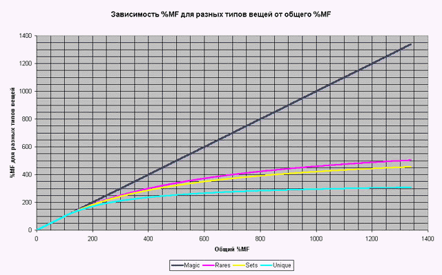 Я до сих пор точно не знаю, что лучше, мф 250-300 или >300 (если ущерба скорости нет). По идее чем больше, тем лучше - т.к. на каждую вещь повышается шанс дропа, но слышал так же что если мф >300, то уменьшается шанс "пустого дропа", а на уники дроп падает... Вообще точно всё о дропе могут сказать только те, кто диаблу делал) мб мф это так, для понта, на самом деле ничего он не даёт Ж)