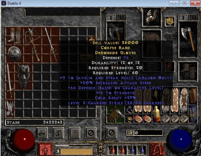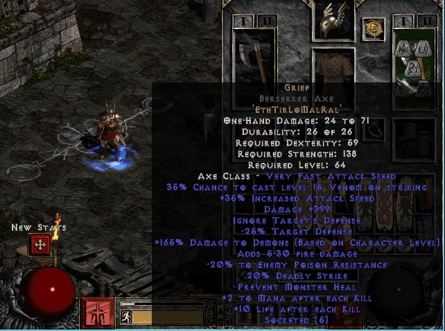 Одел ему: Grief ba + Death ba, arreat ummed, weath в dusk ed, chance, goldwrap, infernostride, metagrid, nagel, good craft ring ml ll str hp mp, torch, gheed, sc/gc mf & eg. Мерк на might