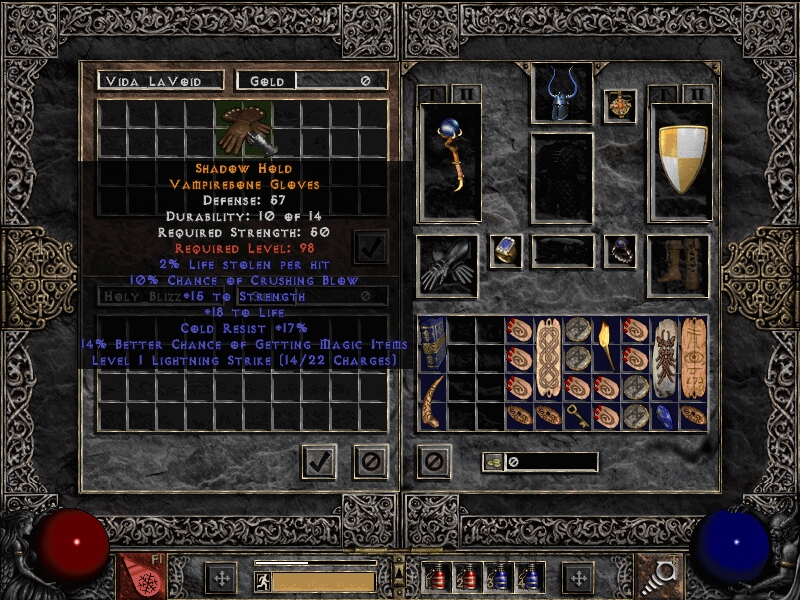 Note that we cannot rule out the 6 charged suffixes with level < 59, because we want a chance to hit the suffix, "of the Giant". But we will try to freeze out as many of the 7 higher charged suffixes as possible. The charged suffixes available on gloves are basically useless and the highest ones increase the rlvl a LOT. You will probably not be pleased with your 'kick-ass' crafted gloves if they require level 98.