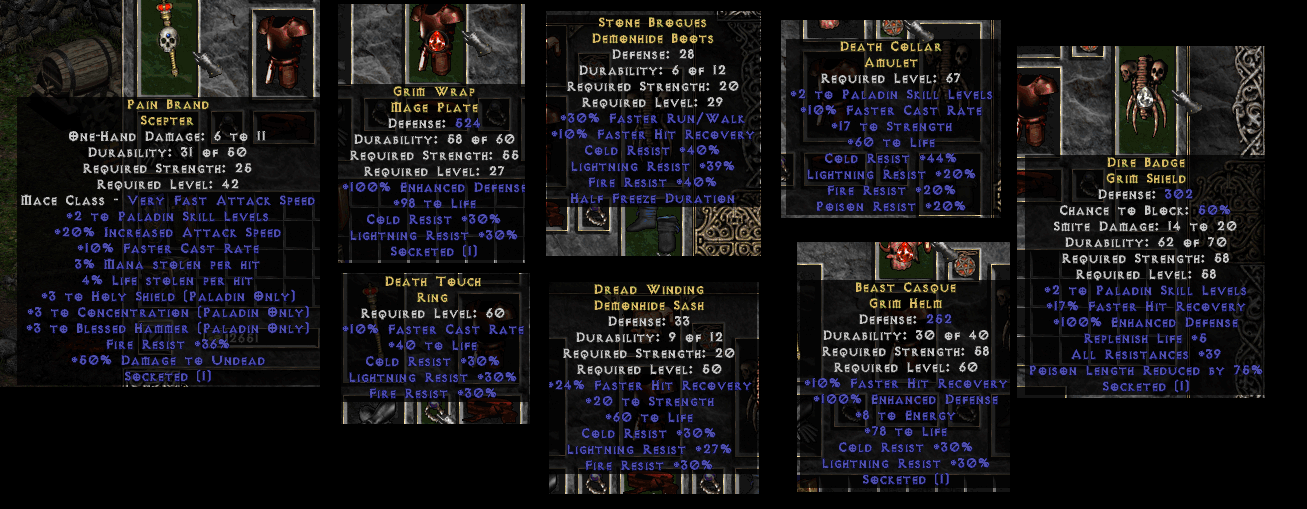 короче говоря, хаму Nokozan, 3pd щит, magefist, fcr кольца, палку от nm Дрогнана (самое нудное. желаемое: 2 pal 10 fcr, дальше пофиг - хам, конца или ничего. 2 pal палки зеленоватые). остальное рарки - резы, хп, если есть - стр. декса на блок не влияет (не нужна). стоит смотреть все рарные щиты в поисках "2 pal allres/fres" (амули в поисках 2 pal +). для сокета в рарке нужен soj. предел хп на шапках/кольцах - 40, на пузе/поясе/амуле - 60. вода в ключах, голова на плечах. :-)
