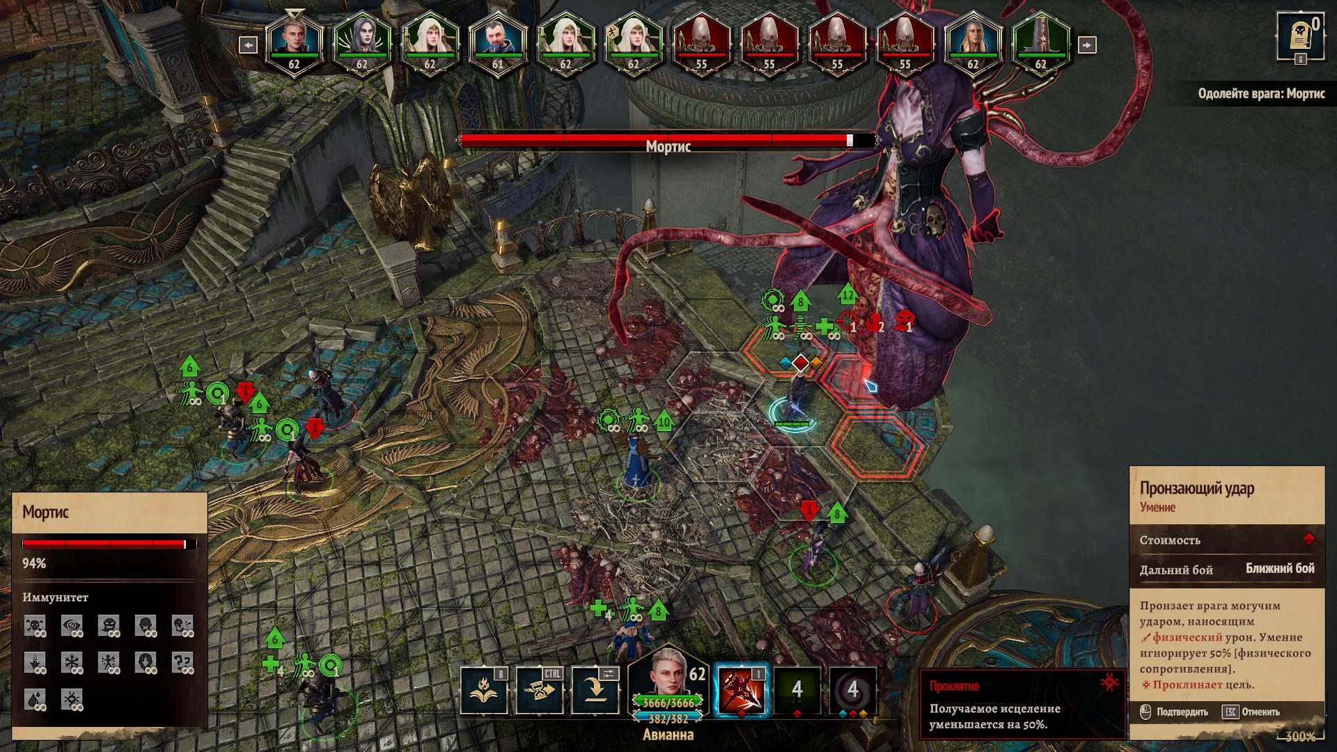 Все это выглядит интересно и служит для разнообразия тактики и возможных комбинаций действий игрока. Вот только сражения очень простые. Искусственный интеллект честно старается противостоять игроку – юниты противника применяют умения правильно, подгадывают моменты, чтобы нанести больший урон, и стараются задеть большее число солдат Авианны, но как раз наличие последней и сводит на нет все старания. Если поначалу это не столь очевидно, то уже на 40-м часу игры героиня берет на себя уничтожение половины врагов на арене. При адекватном подборе экипировки и не совсем уж хаотичной прокачке навыков ближе к 60-му часу можно просто забежать в центр вражеских позиций, применить один круговой удар, и УОП! Неважно, кто там – все живое (и неживое) в радиусе 4 гексов вокруг осядет пеплом. А дальше просто наваливаемся толпой и дочищаем недобитков.