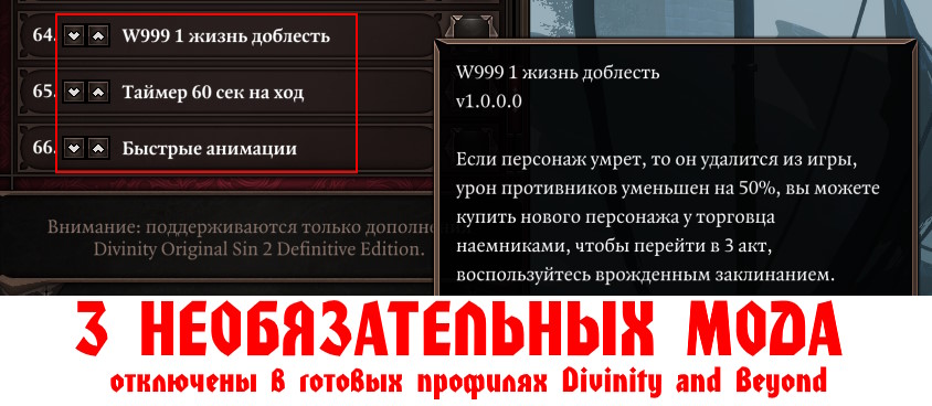 Насчитывается около 50 геймплейных модов и СОТНИ точечных изменений мода - Divinity and Beyond (по общему насыщению в сборке около 100+ модов, с учетом модов на перевод и прочего)