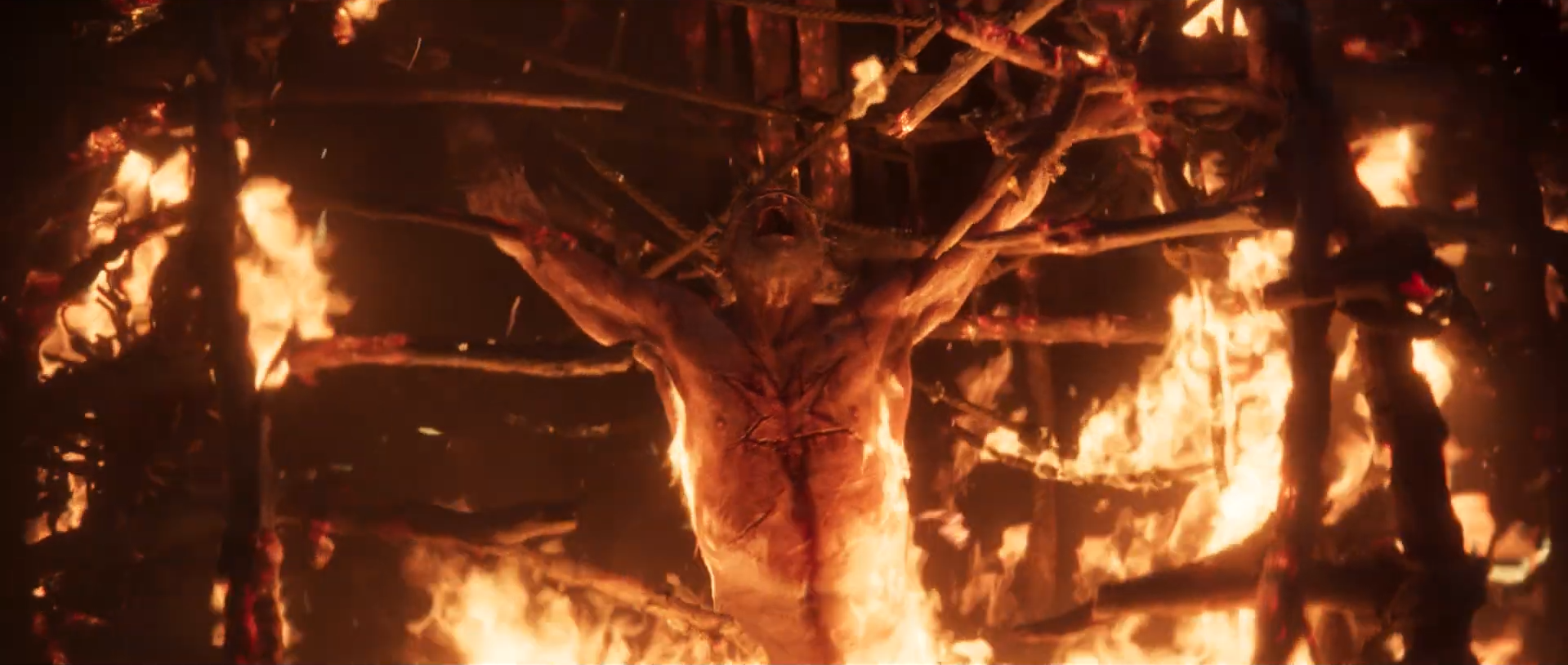 Насчёт жертвы я ещё почитал и скорее всего это - Люциан - правитель Голариона, бывший богом и ставший смертным. Известен тем, что геноцидил эльфов и преследовал всех, кому была подвластна сила "Истока" - своего рода мана. Плюс звезда является тоже символом божественности и местные, как мне кажется, с издёвкой вырезали оную у него на груди перед сожжением.