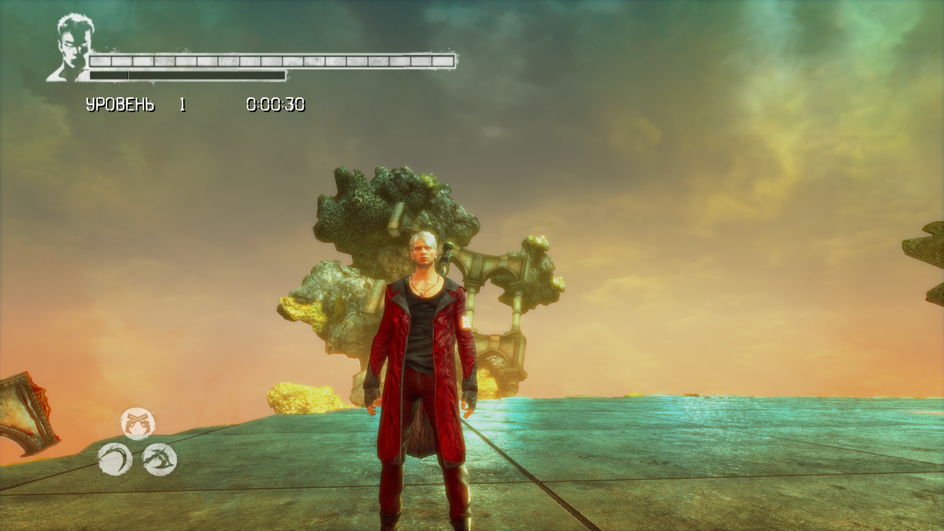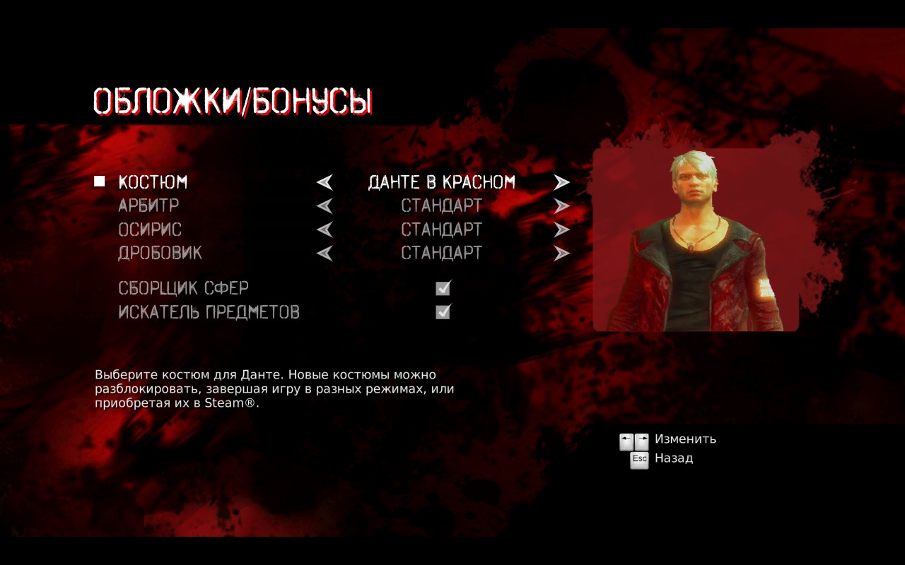 Костюм Данте с белыми волосами полностью перекрашен в красные цвета с черными вставками и черной майкой.