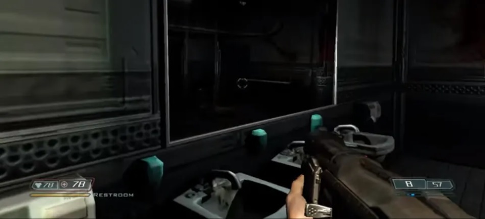 Спустя совсем немного времени после начала игры главный герой открывает дверь и видит за ней мрачную ванную комнату, забрызганную кровью и освещённую тусклым источником мерцающей лампы. И, разумеется, в этой комнате висит зеркало, которое так и просит, чтобы в него заглянули. Конечно же, игрок не может побороть соблазн... Но из зеркала на него смотрит не Кэндимен и не Кровавая Мэри, а искаженное лицо самого морпеха в инфернально-красных оттенках, а на фоне слышны жутковатые звуки.