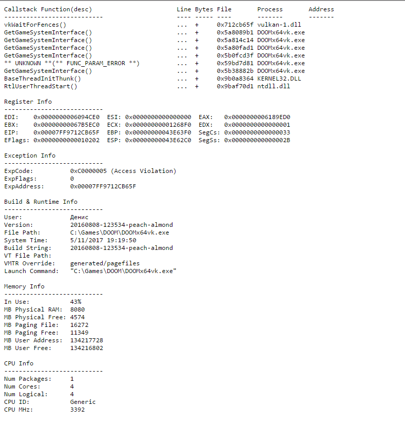 Всем привет. Вот такая проблема возникает каждый раз, когда я пытаюсь запустить DOOM, причём как OpenGL, так и VulkanRT версию. Дрова обновлял, русских букв в пути к папке игры нету. Что ещё можно сделать?