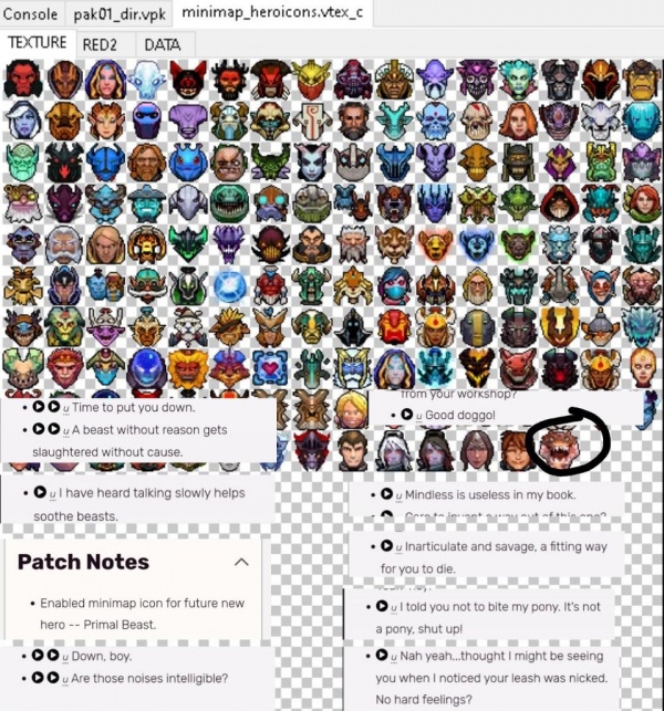 Пользователь нашел в файлах игры иконку Primal Beast, а также запись из патчноута, где упоминалось то, что ему добавили иконку как герою. Он также нашел сразу 10 фраз, которые могут принадлежать новому герою.