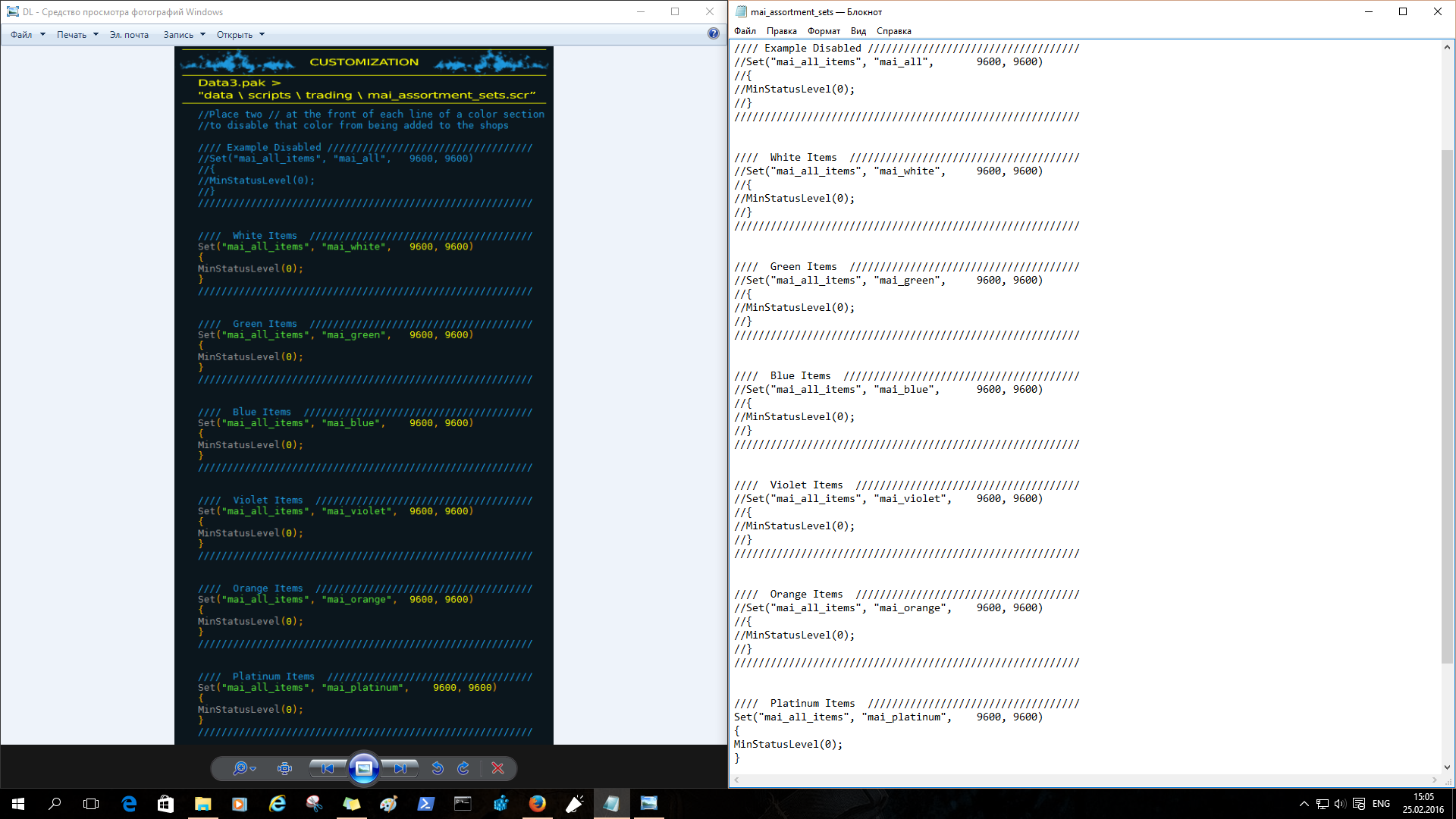 Этот мод добавляет более 1000 товаров в магазин для всех 6 цветов качества оружия, из них несколько сот новое патча v1.10.x The Following. Из-за нагрузки всех цветовых вариаций для всех элементов добавленных в магазин игра зависает от 30 секунд до 1 минуты в зависимости от мощности компа, за это время она считывает более 6000 позиций в списке. Чтобы уменьшить время загрузки если вы не заинтересованы в конкретных уровнях цвета для элементов, вы можете выбрать что бы продавцы продавали предметы определенных цветов. Прошу обратить внимание: мод является базовым исходником на абсолютно весь ассортимет предметов с момента релиза игры, некоторые товары доступны только определенного цвета, так что если вы хотите что бы эти товары были в магазине то вам придется включить это цвет. Скрин отключения и включения на моем примере - слева оригинал, справа переписанный мною вариант что бы продавались только платиновые предметы. Галерея - малая часть нового оружия http://pix.playground.ru/747766/68737/