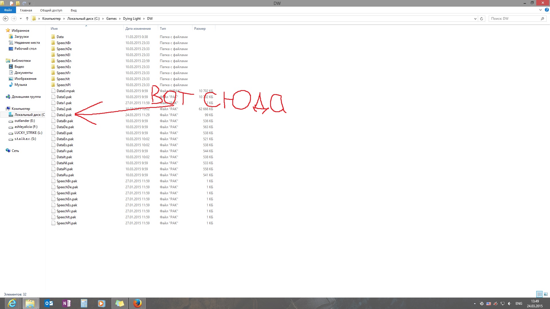 Genom94 Data3.pak находится здесь - C:\Games\Dying Light\DW открыть его можно простым винраром - делаешь копию файла, открываешь винраром, открываешь винраром сам мод скаченный здесь и перетаскиваешь мышкой папку data из архива мода в Data3.pak - далее включаешь игру подходишь к первому продавцу, покупаешь шмот, покупаешь "короля" - собираешь, ставишь объвесы и идешь рубить - колоть - дробить зомби копию файла оставляешь для того если захочешь поиграть с кем то в коопе - просто возвращаешь на место оригинал файла Data3.pak и присоединяешься к другу через стим или тангл кому что ближе
