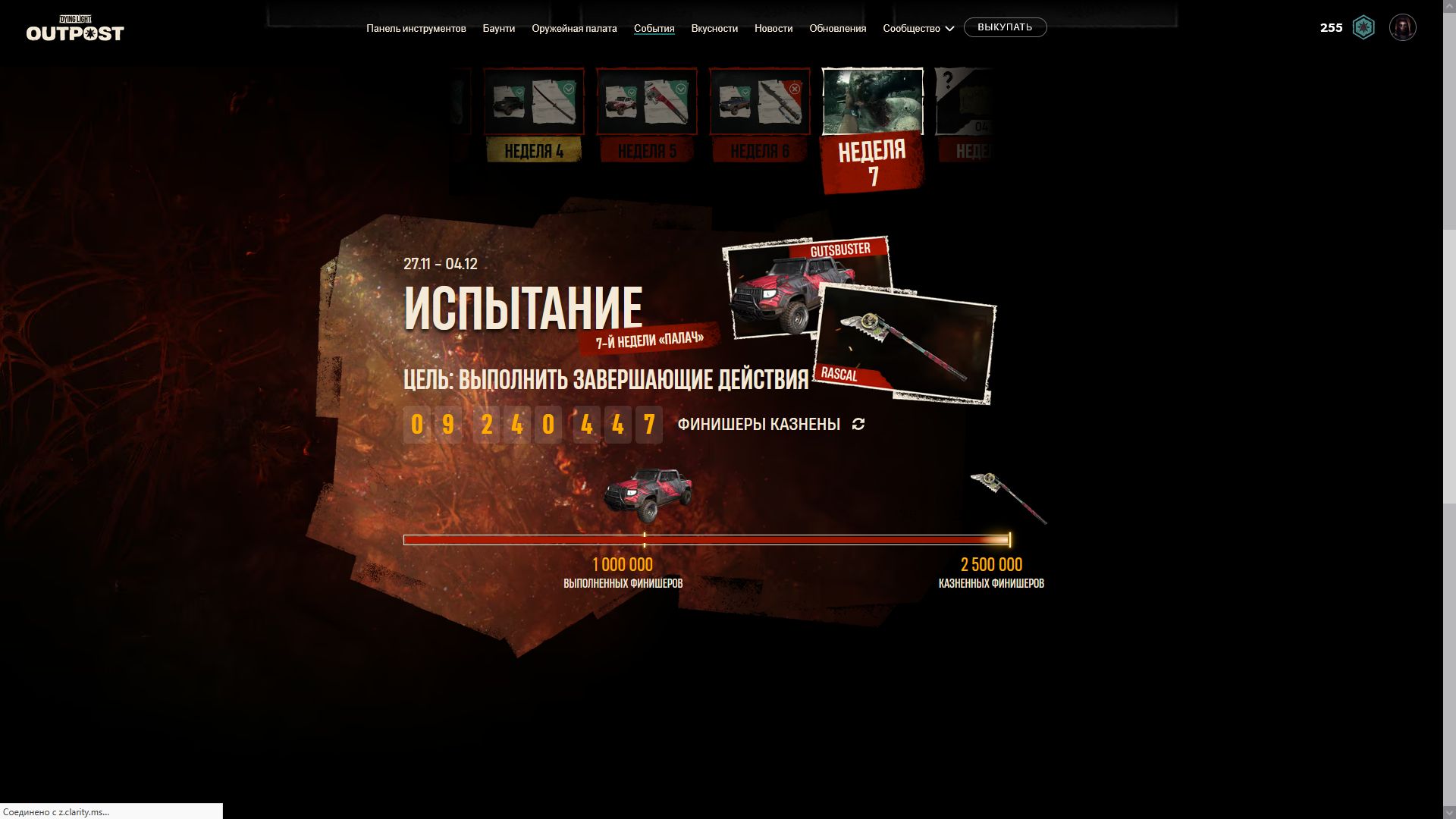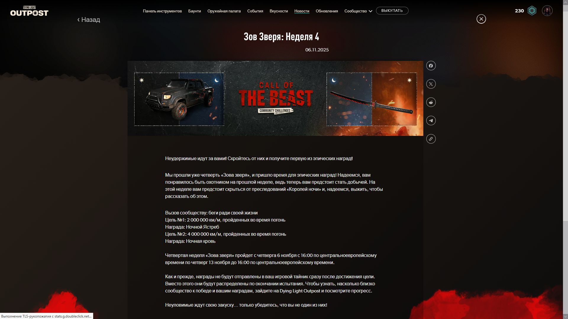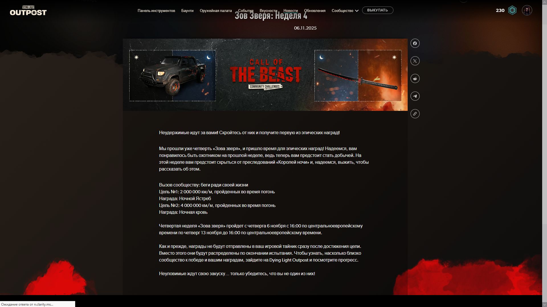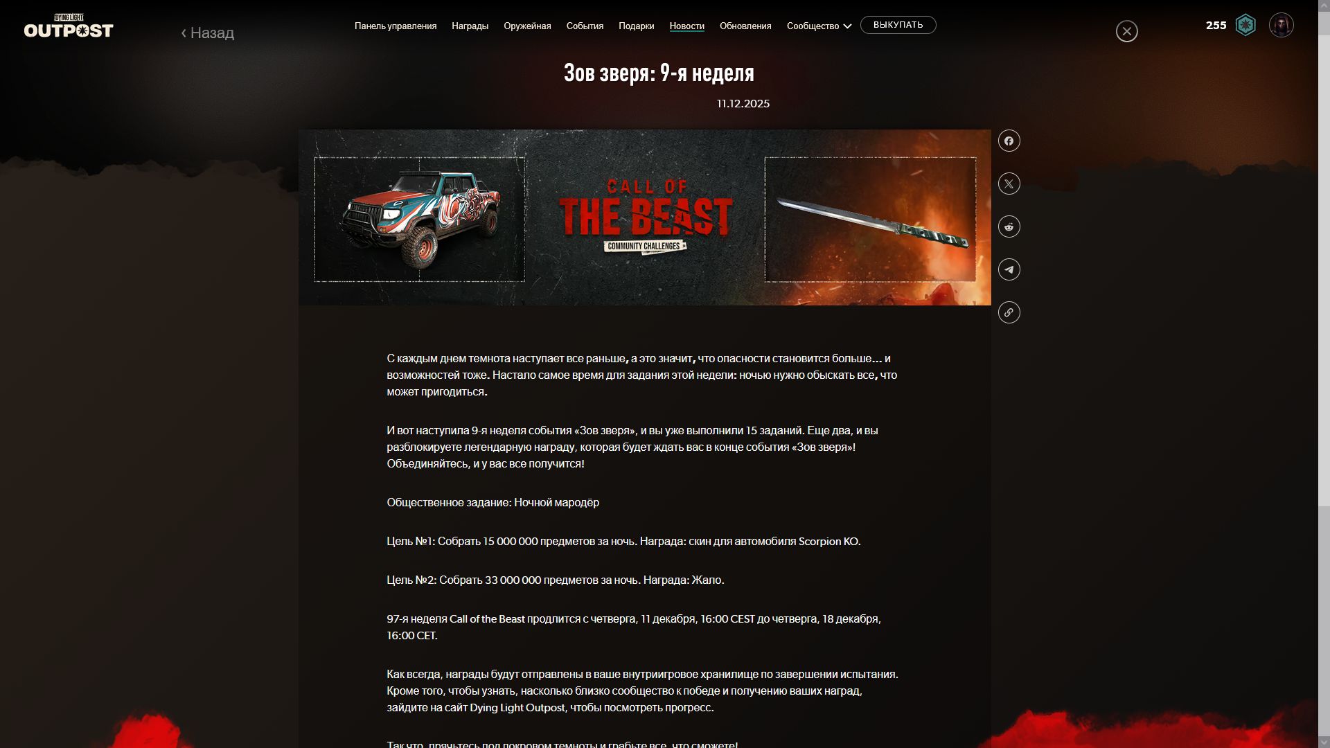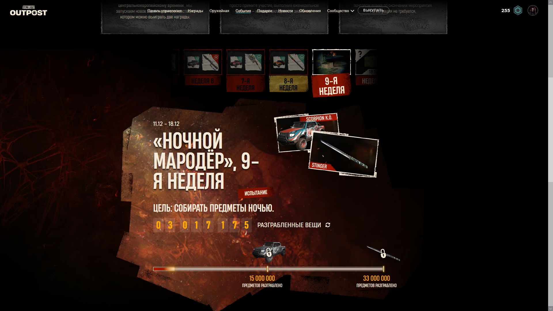 Началась 9я недели испытаний и по достижении цели [собирать предметы ночь] игроки получать чертеж ещё одной катаны и скин очередной скин для автомобиля. Ниже можно увидеть скрины всех предыдущих наград.