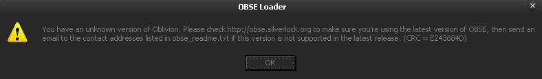 "Вы используете неизвестную версию Oblivion. Пожалуйста, перейдите на сайт http:\\obse.silverlock.org и убедитесь что пользуетесь последней версией OBSE, отправьте сообщение на нашу электронную почту, указанную в obse_readme.txt, если уверены, что используете последнюю версию."
