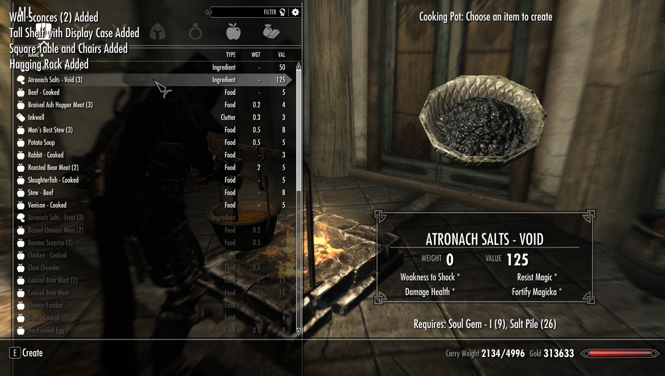 Этот простенький мод позволяет в пунктах приготовления пищи создавать соли атронахов: морозную соль, огненную соль, соль пустоты.