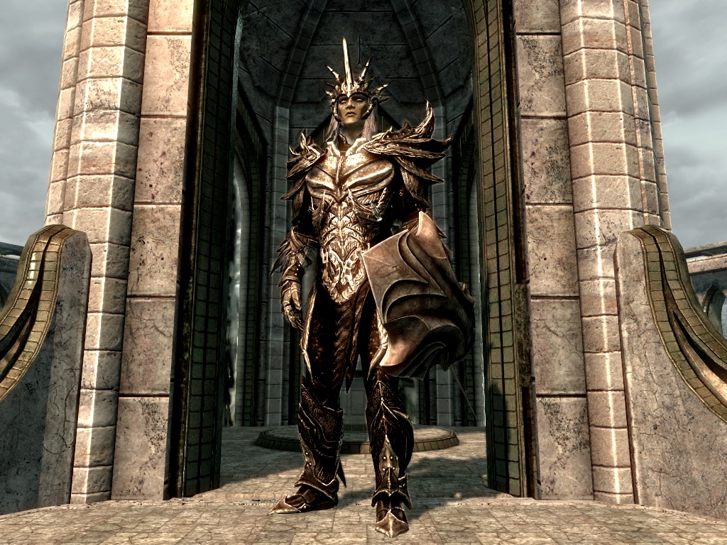 Кираса - чуть перекрашенный даэдрик, "тиара" не похожа вовсе, на статуе она как обруч, а здесь как шлем у Локи из фильма "Тор Рагнарёк" (кто смотрел тот поймет о чём я), про меч сказать ничего не могу (вот бы кто-то сделал одежёнку как у Ауриеля на статуе, мне почему-то очень нравится)