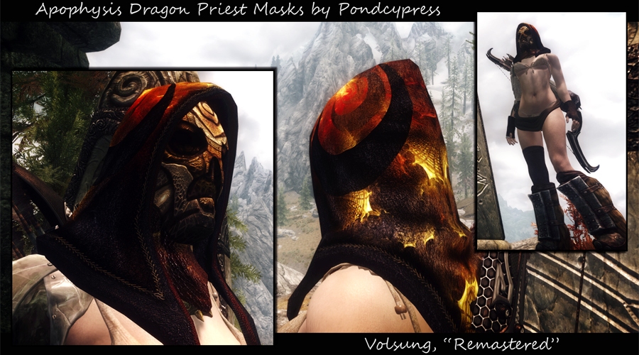 Добавлен патч совместимости для Warmonger Armory (дает возможность носить маску на поясе). файлы нужны и от этого мода, и от warmonger. Добавлен патч совместимости с Открытыми масками драконьих жрецов(в нескольких вариантах). Так-же можно выбрать отдельную маску. Патчи применять после основных файлов, . Совместим с NMM.