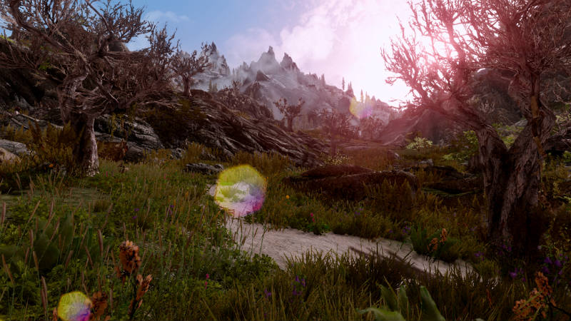 • Данный вариант не затрагивает и не изменяет снег, заснеженные территории, животных, существ и так далее, так что этот вариант является наиболее совместимым с всеми модами, а также совместим с "Skyrim Flora Overhaul" и другими модами изменяющими траву/пейзажи. Погодные моды все полностью совместимы