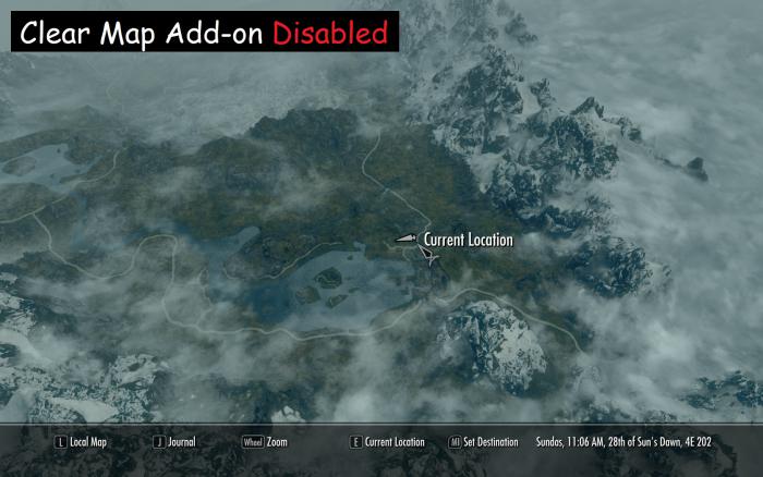 - Optional Clear Map - Удаление внутренних облаков на карте мира, но облака по краям карты останутся. Если у вас есть "sMapCloudNIF=0" в файле Skyrim.ini, пожалуйста, удалите эту строчку или это дополнение не будет работать